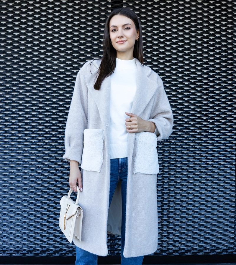 Dlouhý béžový kabát s plyšovými kapsami Badra.