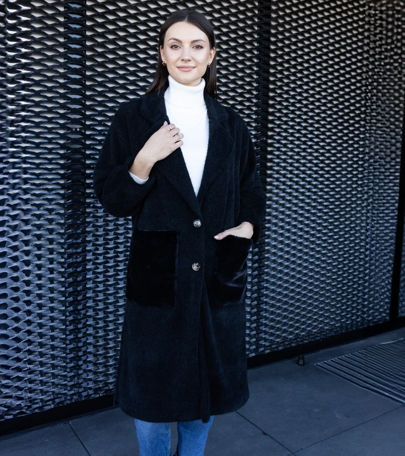 Dlouhý černý kabát s plyšovými kapsami Badra.