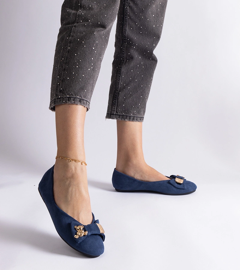 Tmavomodré baleríny zdobené mašlí a broží Esdras