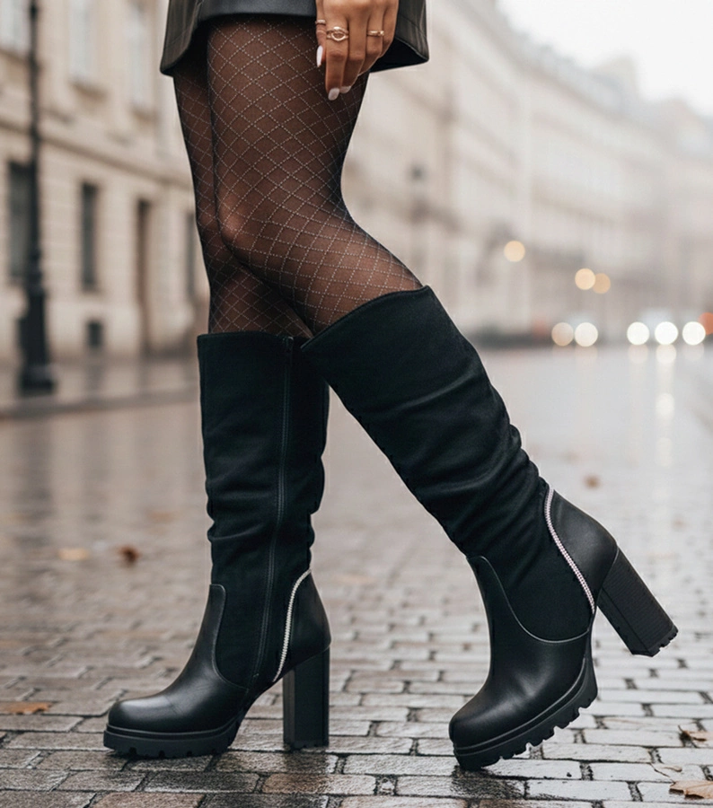 Cerné zateplené kozačky na masivním sloupku Meragomi.