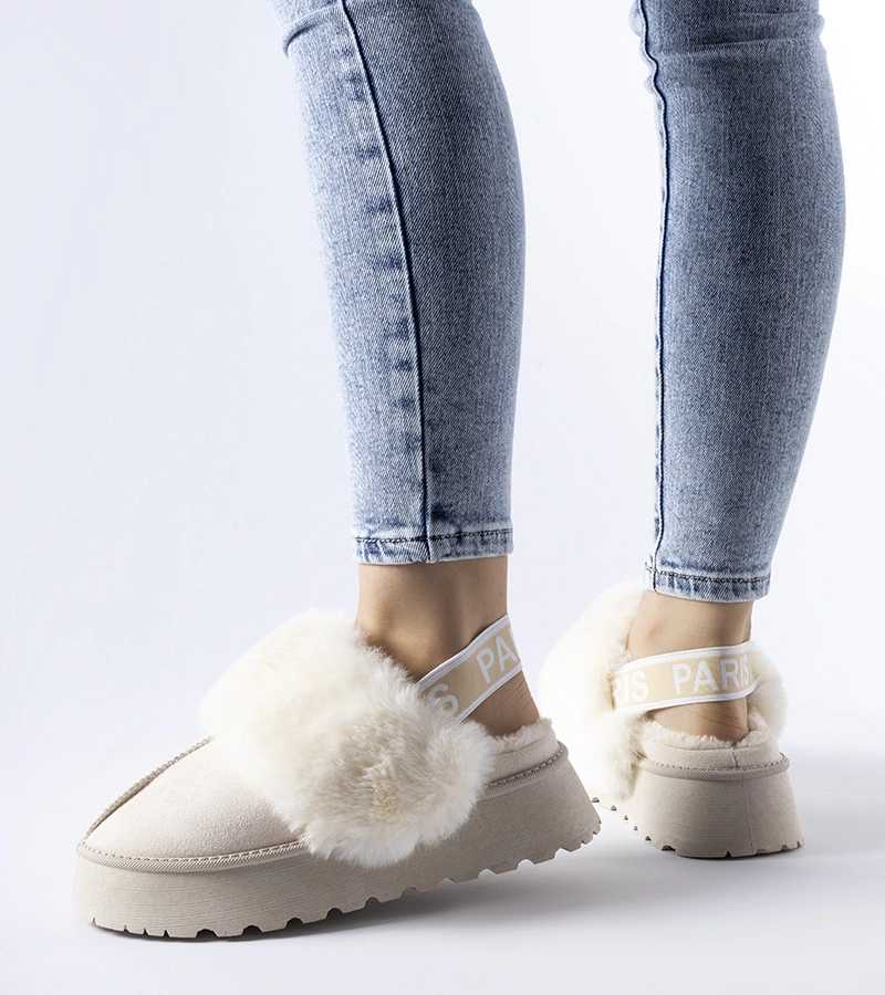 Bežcové teplé pantofle s elastickou páskou a kožešinou Sangro