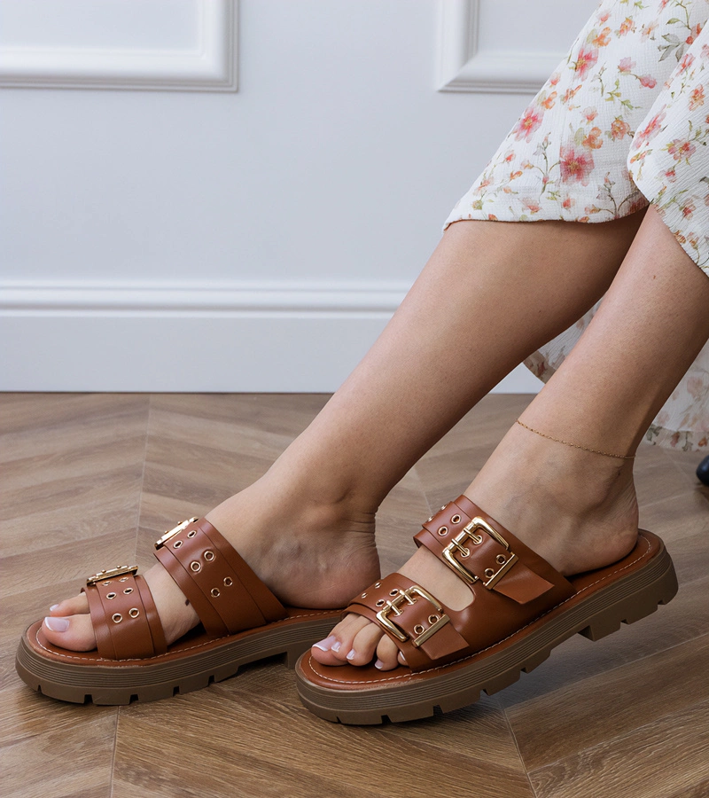 Hnědé ploché pantofle s přezkami na páscích Liluna