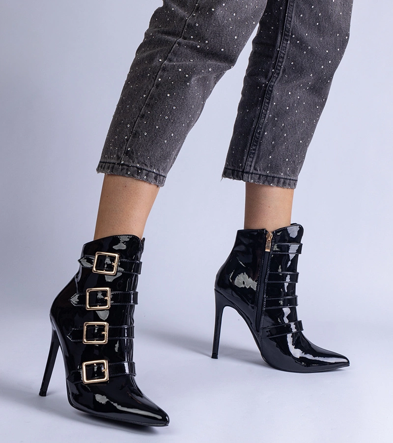 Černé lakované kotníkové boty na jehlovém podpatku Adriana