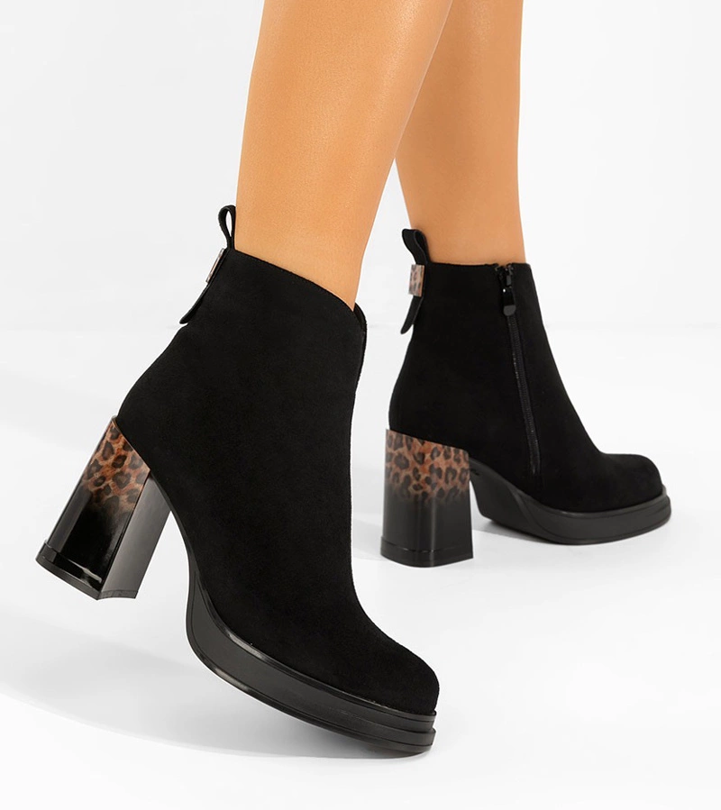 Černé kotníkové boty na podpatku zdobeném leopardím vzorem Delora
