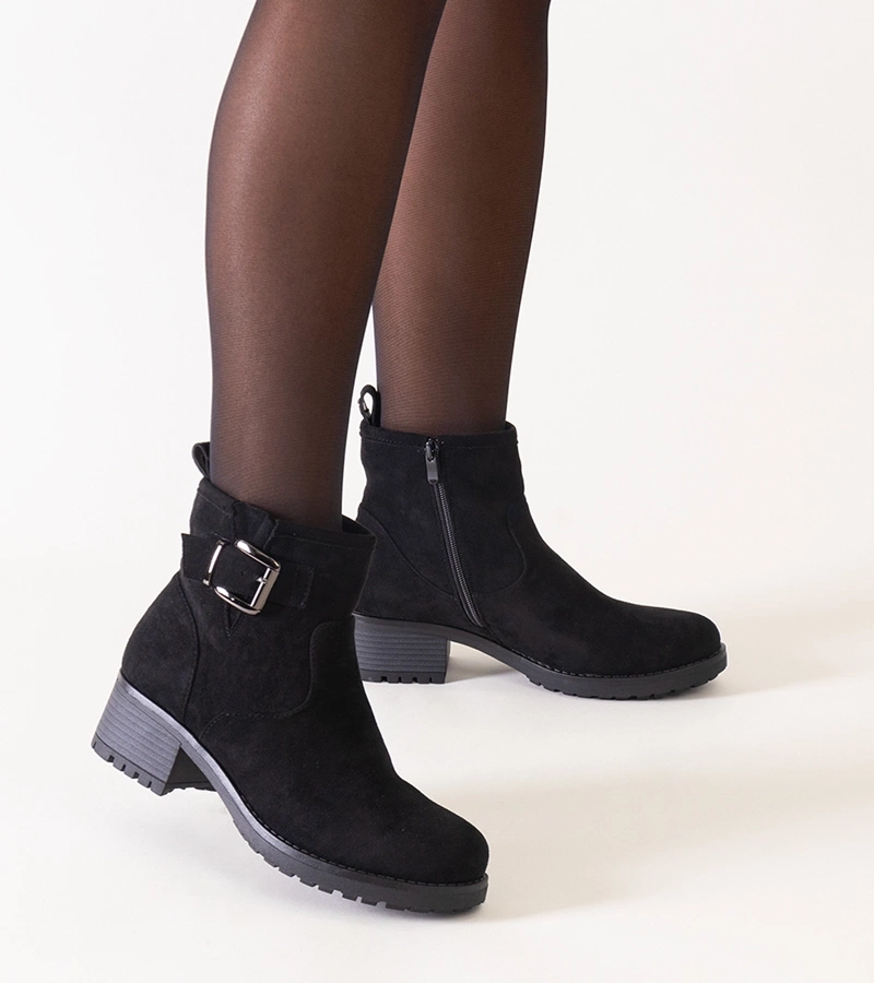 Černé botky s kovovým prvkem na nízkém sloupku z eko-veluru Nadiara.
