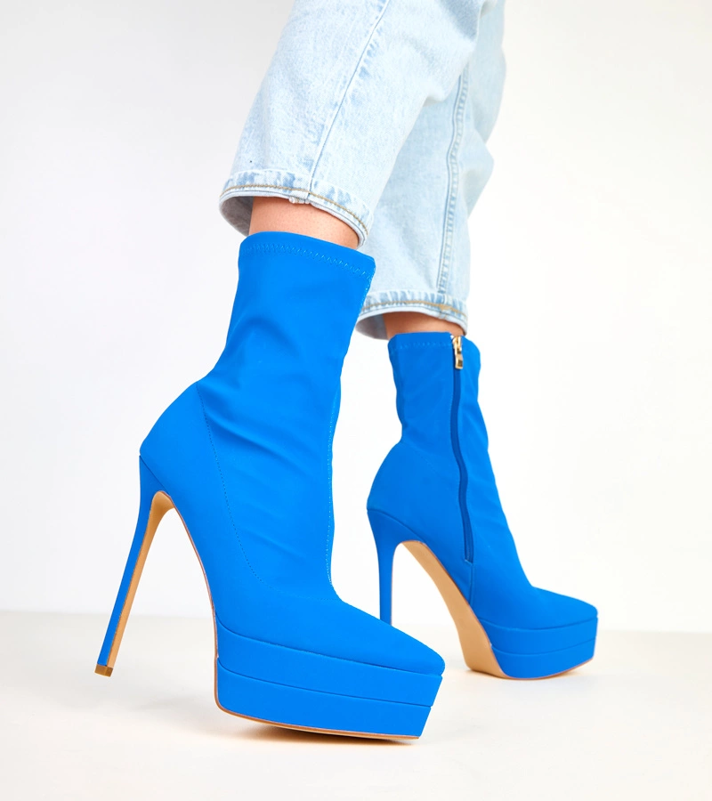 Modré saténové kotníkové boty na jehlovém podpatku s platformou Ramla