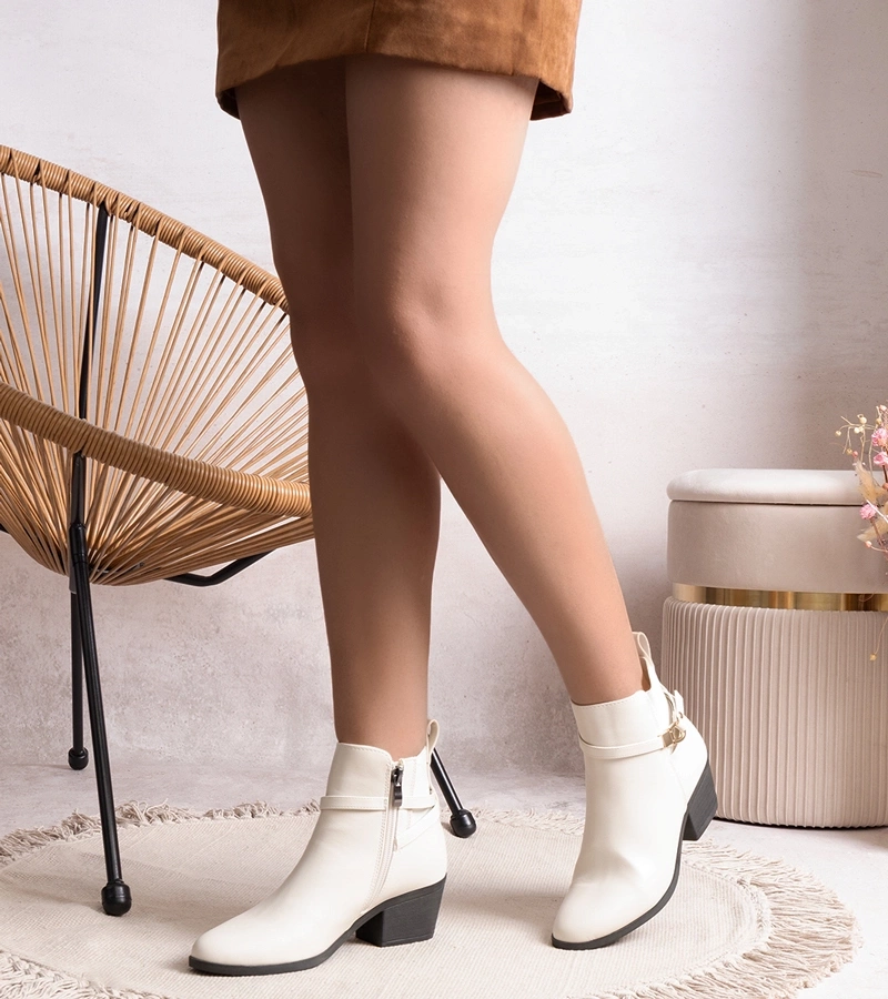 Beige kotníkové boty na sloupkovém podpatku zdobené sponou Torhia.