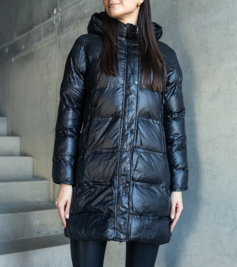 Černá dlouhá prošívaná bunda s odepínacími rukávy zdobená kožešinou Louis.
